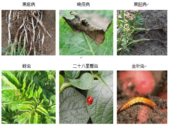 以預(yù)防為主,及時防治病蟲害。苗期——開花期的主要病害有黑痣病、早疫病、晚疫病、黑脛病、環(huán)腐病等。黑痣病近兩年在馬鈴薯上發(fā)生比較多,特別是在苗期地溫較低、濕度大的情況下易發(fā)生,嚴重影響馬鈴薯幼苗的生長。對于黑痣病可以在苗期(苗高10-20cm)使用30%噁霉靈水劑(如國光重茬寶)進行噴灌或滴灌,能有效控制黑痣病的發(fā)生。另外,如果連續(xù)一周以上的陰雨天氣,就容易發(fā)生晚疫病,對晚疫病要以預(yù)防為主,在出苗率達95%后用代森錳鋅、甲霜靈錳鋅進行預(yù)防,發(fā)病初期開始噴灑甲霜靈、霜脲氰、三乙膦酸鋁等藥劑隔7~10天1次,連續(xù)防治2~3次,也可以使用國光三治(50%錳鋅·氟嗎啉)80-107g/畝噴霧進行防治。對于早疫病可以使用百菌清、代森錳鋅等藥劑進行預(yù)防,在發(fā)病初期可以使用甲霜靈錳鋅、霜脲錳鋅、苯醚甲環(huán)唑等藥劑進行防治。對于黑脛病、環(huán)腐病等細菌性病害可以使用農(nóng)用鏈霉素、銅制劑等藥劑進行預(yù)防,若發(fā)現(xiàn)病株及時清除。此期馬鈴薯的主要害蟲有蚜蟲、28星瓢蟲、薊馬、跳甲、金針蟲、蠐螬、小地老虎。對于蚜蟲、薊馬可以使用吡蟲啉、啶蟲瞇等藥劑進行防治,對于瓢蟲、跳甲、地下害蟲等可以使用氯氰菊酯加上甲維鹽防治。