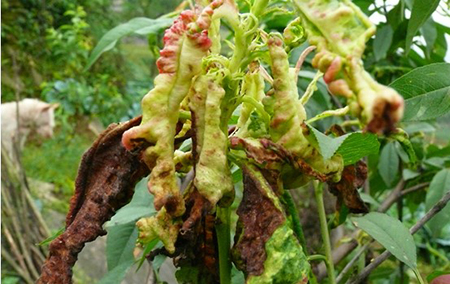 桃樹縮葉病是春季常見的一種病害,桃樹染病引起葉片腫脹皺縮,嚴重時病葉干枯脫落,對產量和品質有較大的影響,還會影響花芽形成和來年的產量。