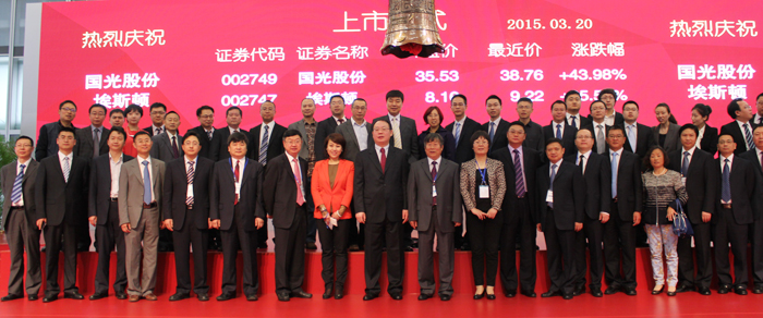 2015年3月20日上午,四川國光農化股份有限公司上市儀式在深圳證券交易所隆重舉行。公司董事長顏昌緒,資陽市委書記、市人大常委會主任周喜安、農業部藥檢所總農藝師季穎、中國農藥工業協會會長孫叔寶、中共資陽市委常委郎寬、資陽市人民政府副市長毛紹百、簡陽市人民政府市長趙春淦等政府主要領導及公司董事、監事、高管出席了上市儀式。
