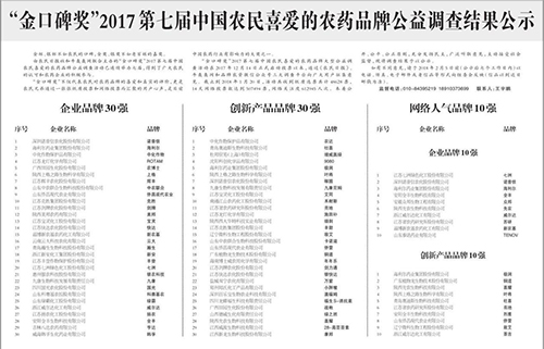 國光榮獲“2017金口碑獎(jiǎng)”,該獎(jiǎng)代表農(nóng)民對(duì)農(nóng)藥品牌的喜愛和真實(shí)的評(píng)價(jià),是目前中國農(nóng)藥行業(yè)有影響力的大獎(jiǎng)之一。