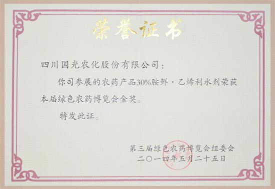2014年5月25日,由中國農藥發展與應用協會主辦的第三屆綠色農藥博覽會在山東濰坊舉辦。依據《中國綠色農藥博覽會參展農藥評選辦法》,經過第三屆綠色農藥博覽會組委會認真評選,“國光30%胺鮮·乙烯利水劑”榮獲第三屆綠色農藥博覽會金獎。這也是繼“國光0.1%三十烷醇微乳劑”獲得第一屆綠色農藥博覽會金獎后再次榮獲金獎。