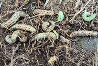 1.年發生代數 一年4-5代,在山東和浙江經調查都是如此。以蛹在土下3-5厘米處越冬。(以危害白三葉為例:2代開始(7月上旬)在三葉草草坪上開始為害,出現一個個蟲團;3、4代(8-9月)為害加重,為主害代,并出現世代重疊,能成片成片吃光草坪,使綠化景觀效果遭受到嚴重的破壞。)